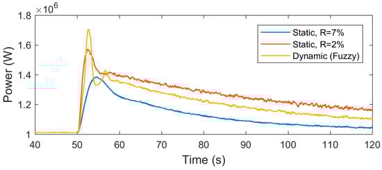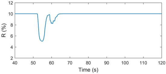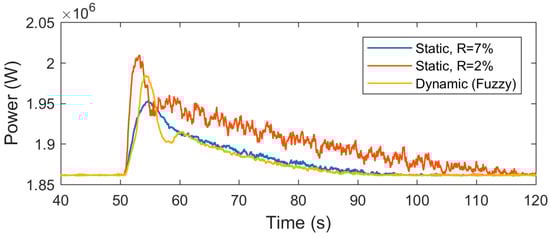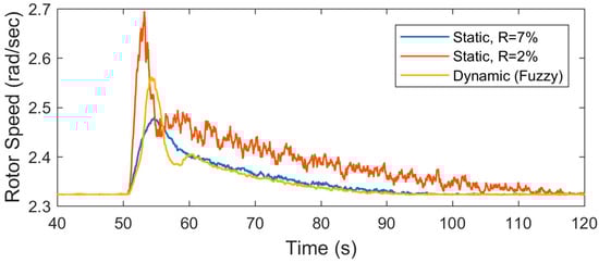 The measured frequency of the power system for the three droops (dynamic droop, and ) is shown in Figure 12. The plot shows the proposed droop controller supports the frequency. The rate of the proposed droop controller is shown in Figure 13. The rate starts at the minimum value, which is 10%, and changes to about 5% in the beginning of the frequency drop. After that, it oscillates and returns to 10% when a new steady state value is achieved.