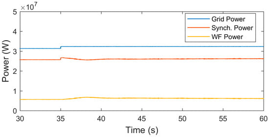In this study, an electrical system shown in Figure 6 is simulated. The electrical grid consists of one conventional synchronous generator with its governor system, wind power plant, and a large load. For the simulation time constraint, single WESs are considered to represent the wind farm. The power supplied to the load is distributed between the wind farm () and the conventional generator ().