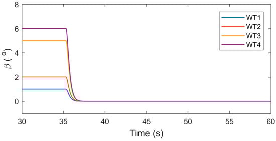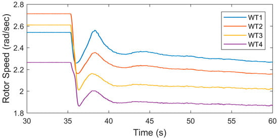 The frequency is measured at the point as shown in Figure 16. The proposed dynamic controller provides support to the grid’s frequency. The frequency goes to the minimum point (nadir) within 3 s and then it starts to return to new steady-state value. The rates of the dynamic controller for all WES are shown in Figure 17. The rates of wind turbines 1 and 2 are slower than the rates of wind turbines 3 and 4; because of the small amount of reserve available in 1 and 2. The power produced by the synchronous generator and the wind farm is shown in Figure 18 and Figure 19. The power produced by each WES is demonstrated in Figure 18. The power of wind turbines 3 and 4 changes rapidly compared to the power of wind turbines 1 and 2 as shown in Figure 19. Also, the rotational speed of each turbine is shown in Figure 20. In this study, the controller of the rotor speed and the pitch angle actuator are activated, and the WES is tracking the reference signal given by the fuzzy logic controller as demonstrated in Figure 21.