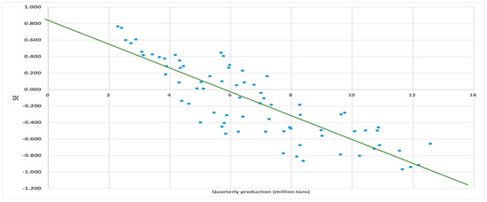 The distribution of quarterly production and SE, and their trend line estimated by robust linear regression, are depicted in Figure 3. It shows that the intercept of the trend line with the x-axis is 5.81 million tons, which is the same value of MES that is calculated above.