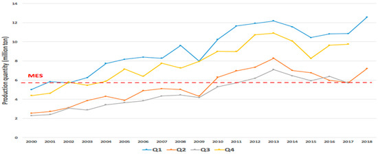 Minimum efficient scale (MES) and actual quarterly production quantity.