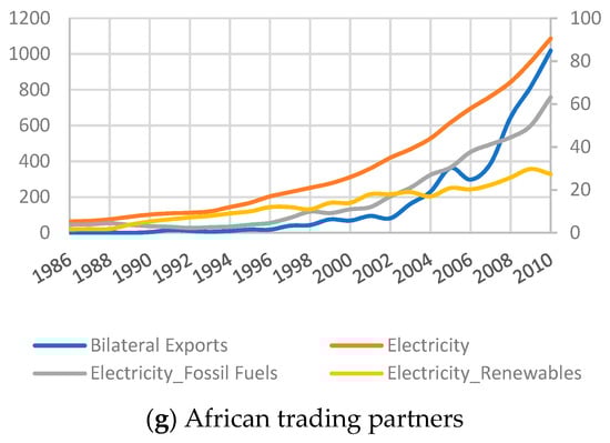 Several recent studies showed that economic growth is driven by renewable energy in developing nations (see [28] for a review). We found only two studies that examine the link between renewables and trade [32,37]. In [37], the authors found no short- or long-term causality over the period 1980–2008 between renewable energy consumption and trade in 11 African countries. For a panel of 69 countries, over the period 1980–2010, [32] found that a 1% increase in renewable energy increases exports by 0.07% in the long-term.