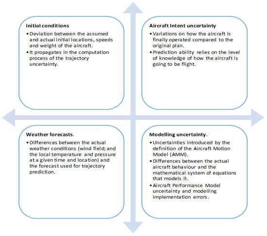 When modelling aircraft trajectory, there are several factors introducing uncertainty to the trajectory computation model. Identification and characterization of the main sources of trajectory uncertainty, hereafter referred as influencing factors, will allow building an uncertainty model for complexity calculations. The latest and most advanced works in this domain have been used to drawn the main influencing factors [11,12], as illustrated in Figure 2.