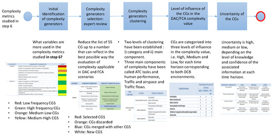 COTTON project approach for the identification of CGs is a top-down review of existing complexity metrics (see Step 6) combined with a bottom-up analysis of complexity generators in the context of DAC and FCA. In support of this bottom-up approach, a workshop was organised with attendance of experts on complexity, trajectory optimisation, DAC and FCA concepts. The workshop addressed the identification of the CGs that have strong influence in the complexity value for each time horizon and operational concept, DAC and FCA. The selection of the most influential CGs was based on expert judgments following the method described below and summarised in Figure 4.