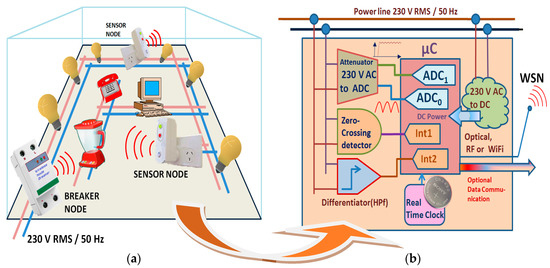 (a) Wireless sensor network for transient detection and self-protection: a proposal; (b) diagram of the presented node platform.