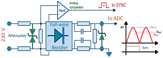Processing from rectified voltage is proposed because the dynamic range of the ADC converter is doubled. In this sense, all the programming codes of the microcontroller will take into account the absolute value of the sinusoidal voltage, abs[V(t)], but it is necessary to know the original sign of every rectified half-wave. This function is achieved by utilizing an analog-comparator.