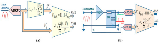 (a) Average voltage and root mean square (RMS) value applying digital processing. (b) A fast calculation method to get VRMS and Vavg values from the peak value acquired (applying Vpeak, VRMS and Vavg relationships).