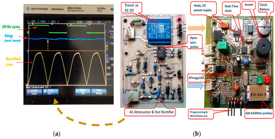 (a) Oscilloscope image showing the sync pulses (green) and the average value (blue) of the full-wave rectified voltage (yellow), from the power board (left); (b) a prototype photograph: the microcontroller unit (at right) and the high voltage board (rectifier + attenuator, at center).