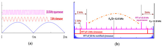 (a) Input voltage (a full-wave rectified 50 Hz sine wave) and two oscillatory signals (1 kHz sine wave and 10.8 kHz square wave) sampled to 12.8 kHz. (b) FFT of each waveform: when the disturbance spectrum is greater than Fs, the spectrum is reflected and overlapped; transients may be qualitatively identified into the below zone from the Nyquist frequency. (Simulated by OctaveTM (GNU) to N = 256 points/period, FS = 12.8 kHz and 50 Hz equivalent FFT spectral resolution).