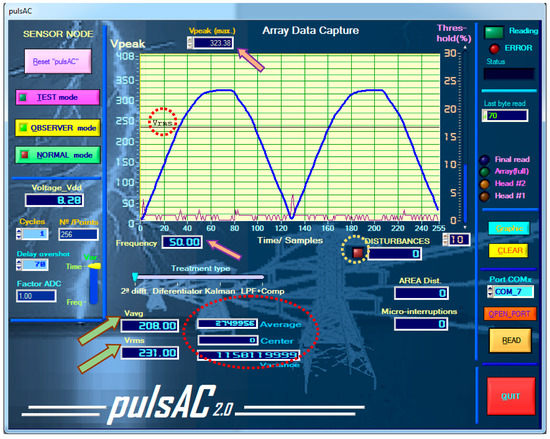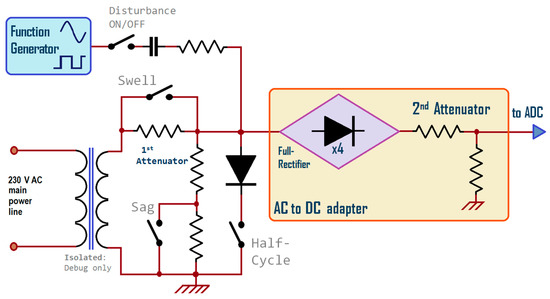 As depicted in Figure 2, the analog-to-digital conversion (ADC) is realized from an attenuator and rectifier adaptor (adding overvoltage protection, as TransilTM or TransZorbTM devices). Thus, the voltage at ADC input is a scaled value, smaller with respect to the no-rectified voltage present on the AC power line. The AC voltage divider introduces an attenuation factor of 57.5. In this way, a 230 V AC is represented in the ADC by 4 V DC. Regarding the IEC 61557-12 standard, referring to root mean square (RMS) and swell and dip measurement, the ‘120% Un’ limit is equivalent to 276 V RMS. The maximum value measurable with this attenuator is 287 V RMS (ADC full scale). However, concerning IEEE STD 1159-2009, the maximum RMS voltage (swell cases) is higher than 400 V. To increase the range, a solution could be to use an additional attenuator, with a factor divider higher than 57.5 and connected to other ADC input available (e.g., a factor of around 100).