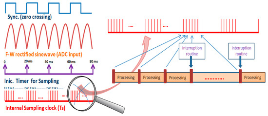 To maximize the processing speed, a fast state machine was implemented using the incorporated features into the microcontroller, mainly the internal interrupting architecture. The acquiring process starts every detected zero crossing. An internal clock counter is configured to generate software interruptions during an equivalent time to the sampling period. This interruption routine forces the system to acquire an input voltage sample and save it. A counter variable allows for the conversion of a frame of up to 256 sampled data. The available free time between adjacent-acquisitions permits the processor to run the required detection algorithms (Figure 7). When the synchronism is different to 20 ms (50 Hz), the internal counter generates a count overflow. This event marks an anomaly situation.