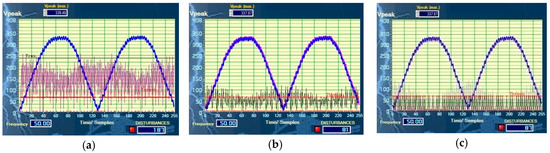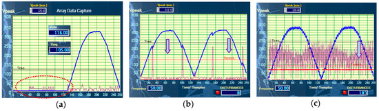 Figure 9. Helmholtz equation method detection test (Blue line: sampled voltage; Magenta line: magnified value resulting from (13); red line: threshold level. The VRMS value is computed from Vpeak measurement): (a) half-cycle missing, Vavg = 105 V (with respect to 326 V peak). No detection in this case. (b) Superimposed square wave of A = 10% of Vpeak, F = 100 Hz, with 8 detections/cycle as resulting. (c) Oscillation, sine wave, 10% of Vpeak (0.1p.u.), adjust. th. = 5%, F = 10 kHz, with 187 detections/cycle. - When a square voltage (1 kHz or 100 Hz) is superimposed (Figure 9b) the algorithm presents a good detection response (relative threshold = 5% adjustable from 0 up to 30%). It also works correctly for high frequencies (10 kHz and 100 kHz, even greater than FS (Section 4.4)