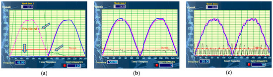 Figure 10. Kalman filter (Blue line: sampled input voltage; Magenta line: Kalman prediction; Green line: error) (a) Half-cycle missing, Vavg = 104 V, Veffective = 115 V RMS and 125 disturbance detections (aprox. 256/2). (b) Superimposed square wave, 10% of Vpeak, F = 100 Hz, relative threshold adjusted to 6%, with 4 failure detections/cycle. (c) Oscillation, sine wave, 10% of Vpeak, F = 1 kHz and relative threshold 6%, with 78 detections/cycle. - Since detection is a strategy based on prediction, the code correctly detects the square transients (Figure 10b). When a square wave voltage is superimposed (frequencies of 10 Hz to 1 kHz), the algorithm presents a good differentiation (up to a relative threshold level of 6%, adjustable).