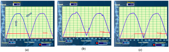 - Voltage fluctuations testing: the slow voltage variation generates small differences values in the derivative algorithm given by Equation (13). This method is insensitive for phenomena such as sag or swell voltage.