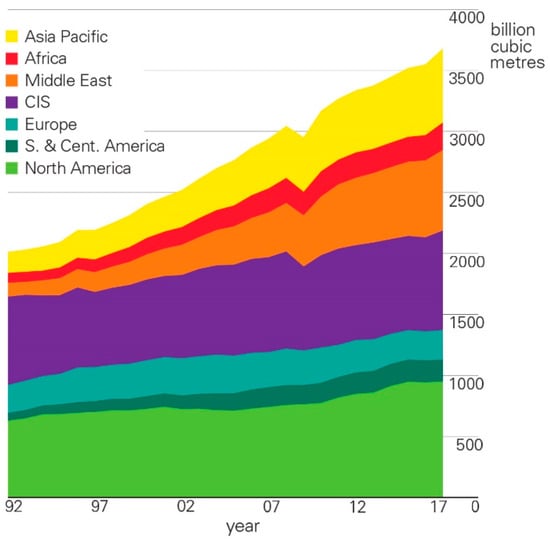 Consumption of natural gas by region in billion cubic meters 1992–2017 [10].