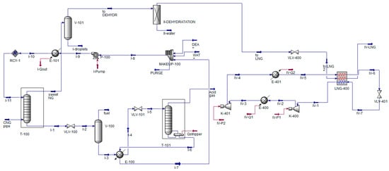 Technology simulation was conducted in Aspen HYSYS software with the physical packages “Acid gas” for a description of the acid gas treatment and the “Peng-Robinson” package for the other simulations. In Figure 4, the simulated process flowsheet is presented.