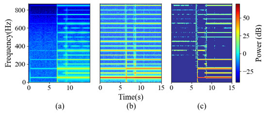 However, experiments shown in Figure 2 prove that Equation (1) does not strictly hold. Figure 2a shows the microwave spectrogram without background loads, which is measured in the laboratory. Figure 2b shows the microwave spectrogram in the UK-DALE dataset, Figure 2c shows the spectrogram calculated by spectral estimation based on the previous hypothesis of Equation (1). Although there is a strong correlation between Figure 2a and Figure 2c, spectral estimation does not eliminate the background load precisely, there are still intermittent spectral lines before the appliance is turned on. Besides, compared to Figure 2a, some detail components are eliminated in Figure 2c after the appliance is turned on. These phenomena prove that the background load has a certain degree of stationarity, but this does not mean it is exactly unchanged, and is not equal to . Accordingly, the background load needs to be estimated more reasonably.