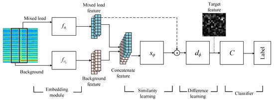 The CNNs in the embedding module are placed at the front end of the network to convert the image matrix into a vector, which is in Equation (3), and here the module comprises two networks with the same structure and different parameters. The similarity learning module is used to generate the similar part in the concatenate feature and get the background feature behind the mixed feature, we refer to this as the “implicit background”, distinct from the “explicit background” extracted from the background-only load. The concatenation is channel-wise. The difference learning module converts the features of the mixed load and the “implicit background” to the target feature . The final classifier determines the label of the target load through the target feature maps. The loss function is the cross-entropy function: