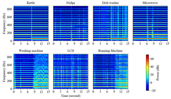 Most of our experiments are based on the UK-DALE dataset. The UK-DALE dataset contains electrical data from 5 houses for up to 655 days. A 1/6 Hz aggregate (mains) and individual appliance (submetered) power data were recorded for each house. Houses 1, 2, and 5 are selected as our original data source because only these 3 houses contain 16 kHz aggregate voltage and current data, then 16 kHz data is downsampled to 2 kHz to draw spectrograms. For submetered data, dataset authors did not record 16 kHz data. The switching events are detected with the help of submetered data (6-second time interval). For all experiments on UK-DALE, house 1 and house 5 data are set as the training set, and house 2 data is set as the test set to measure the generalization ability of our model. Seven classes of appliances are used for classification—kettle, fridge, dish washer (DW), microwave (MW), washing machine (WM), laptop or monitor (LCD), and running machine (RM). The number of appliances in each house and appliance spectrograms are shown in Table 1 and Figure 6, respectively.
