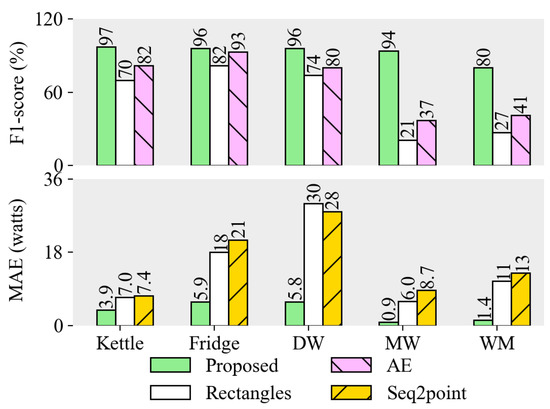 Five target appliances are selected for energy disaggregation except for LCD and RM in the classification task. The performance is presented on house 2 appliances with the training of house 1 and 5 data. True or false binary judgments no longer depend only on the classification of switching events, but whether each data point matches, thus the F1-score here takes power estimation into account, called the M-fscore in [34]. Mean absolute error (MAE) is introduced to measure the error in every single point [15]. Figure 9 shows the disaggregation result on house 2. The proposed model is compared with the best result in Kelly and Knottenbelt’s paper [15] in terms of F1-score and MAE, that is, the “Rectangles” architecture, and the performance is also compared with the result of AE [28] in F1-score and seq2point network [29] in MAE.