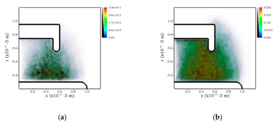 The distribution of electrons’ weight, radial velocity, number density, and ions number density are shown in Figure 3. The input parameters of the simulation are presented as the following. The simulation results are at 5 × 10−9s in a quasi-steady discharge process. Tthe voltage was set as 100 V and the discharge current as 400 A. The Ar gas mass flow rate was 4 g/s and the particle weight was 106. Most variable weight of the electrons range from 1 to 1000, which have 106 real electrons in every super-particle. From Figure 3b, the electrons’ velocities, at about 106 m/s in the cathode vicinity, are higher than other regions. It can clearly be seen from the Figure 3c,d that the number densities of charged particles in the cathode vicinity are far less than that in the bulk plasma.