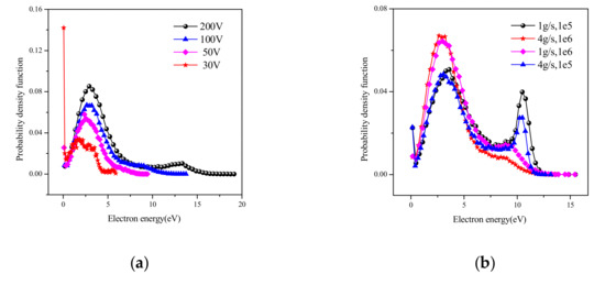 In Figure 7c, most electrons were distributed in the axial coordinate from 0.2 mm to 0.8 mm when the voltage was 30V and 50V, and it appears to be the highest in the middle, gradually decreasing to both sides. As the voltage increases, more electrons were distributed on both sides, which shows more even distribution with the voltages of 100 V and 200 V. In the same way, in Figure 7d, the electrons’ probability appears more uniform in the axial direction with electron weight at 106 rather than that at 105. In a word, with the high voltage and particle weight, the distribution of the electrons was more uniform in the axial direction.