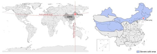 Figure 1 shows that the longitude and latitude of Shenyang in northeast China are 123.38 E and 41.8 N, respectively. In the global climate classification, Shenyang is placed in a region characterized by its temperate semi-humid continental climate. According to the design standard for energy efficiency of public buildings [42], Shenyang belongs to the severe cold area C of China. The heating season in Shenyang lasts for 150 days, from November 1 of each year to April 1 of the following year. The main climate indicator for the severe cold region is the average outdoor temperature of less than −10 °C in January. Meanwhile, the average outdoor temperature is less than 25 °C in July. Therefore, schools in Shenyang are expected to have greater heating than cooling needs throughout the year.