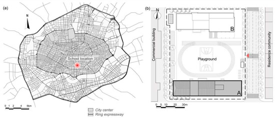 Location of selected primary school in Shenyang City (a), Site map (b).