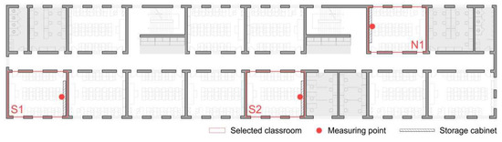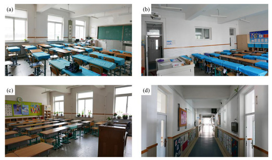 Three 5th grade classrooms on the fourth floor of the teaching building were selected as the research object for data collection; classroom S1(S1) and classroom S2(S2) face south, and classroom N1(N1) faces north (Figure 3). These are representatives of classrooms with different orientations and locations (middle and side), and they house pupils in the same grade for consistency of comparison. Classrooms are typically crowded spaces, especially in China. When school is in session, between 32 and 38 pupils (aged 9 to 12) are present in each classroom. The per capita area of each classroom is 1.43–1.65 m2, which meets the standard 1.36 m2/p according to the code for design of school (GB50099-2011) [5], but this is much less than the per capita area of an average classroom in the United States [29] and in European countries [43]. The characteristics of the classrooms studied are presented in Figure 4 and Table 1.