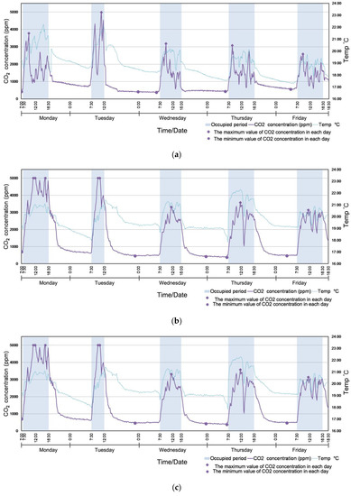 Figure 5a,b,c show a 5-day plot of the CO2 level and temperature variation in the three classrooms. The CO2 concentration changed dramatically during the occupied period (grey bars) with a maximum of 5000 ppm and a minimum of 696 ppm. In a closed classroom, the main source of CO2 was the students’ respiration, and its concentration changed with the number of students [8,21]. In this study, pupils start arriving in the classroom after 07:00; the CO2 levels started to rise when the pupils entered the classroom. The peak period for pupils entering classrooms was between 07:30 and 07:45 every morning. At about 07:45, the CO2 concentration exceeded 1000 ppm, and at about 08:00, the CO2 concentration exceeded 1500 ppm. After that, CO2 concentrations were almost all above 1000 ppm during periods of classroom occupancy. The variation of CO2 concentrations in the three study classrooms on each day was similar, increasing at times the classroom was occupied and decreasing at times when the pupils were taking a break. The magnitude of the increase and decrease was mainly related to the number of pupils in the classroom and the times when windows were opened. The CO2 concentration decreased after school was over until the time that the classrooms were closed to the CO2 concentration outside. The rate of decline depended mostly on whether the windows were opened or not after school was over. During the occupied period, the variation of temperature is also related to the frequency and length of window opening, which is very similar with CO2 concentration. The range of indoor temperature variations in the three classrooms was 16.50–22.23 °C in S1, 16.75–22.73 °C in S2 and 18.77–22.29 °C in N1, respectively, which indicates that the indoor temperature fluctuates slightly.