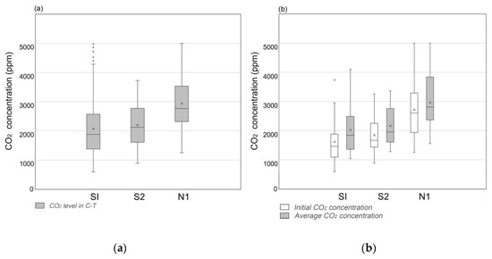 During the C-T periods, the CO2 concentration in the three study classrooms generally showed an upward trend. Statistical results indicate that the higher the initial value of CO2 concentration in the classrooms, the higher the average value (see Figure 6b). The initial CO2 concentration of 94.3% in the three classrooms was higher than 1000 ppm; these values were 696–3420 ppm (S1); 957–3514 ppm (S2); and 1452–5000 ppm (N1). The maximum values of the average CO2 concentration in the three study classrooms were 3384 ppm (S1), 4229 ppm (S2) and 5000 ppm (N1); these values are 3–5 times the reference value. The mean median CO2 concentration values were 1843 ppm (S1), 1955 ppm (S2) and 2808 ppm (N1).