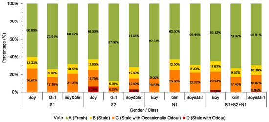 The votes of boys and girls in each class were compared. There were few differences in voting between boys and girls in the same classroom. 87.5% of girls and 56.3% of boys in classroom S2 voted that they felt the air was fresh. However, it can be seen that overall, 62.5% of girls and 83.3% of boys in classroom N1 thought that the indoor air was fresh in their classrooms. The difference in voting between boys and girls in S1 was significantly smaller than that in S2 and N1. Overall, there was no significant difference between genders by comparing the votes of boys and girls in three classrooms.