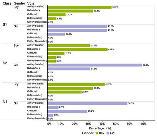 The voting results of satisfaction with the indoor air quality of the three classrooms are shown in Table 8 and Figure 8. 80.2% of pupils expressed their satisfaction with IAQ (A+B). 84.2% of S1 pupils, 77.5% of S2 pupils and 69.5% of N1 pupils cast satisfied votes. At the same time, only 2.6% to 6.2% of all pupils in the three classrooms voted that they found the IAQ unsatisfactory (D+E). The average level of unsatisfactory votes was only 3.7%, indicating that most pupils were satisfied with the indoor air quality. Although the satisfaction rate of the N1 classroom was lower than that of the S1 and S2 classrooms, the unsatisfactory votes of N1 was only 2.1%, slightly less than that of the other two classrooms. Fewer boys in the three classrooms voted that the air quality was good (A+B) than girls did, but the difference was not significant between genders.