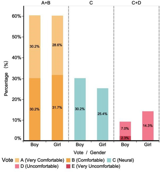 In this paper, the results of voting on pupils’ comfort level with opening windows are shown in Table 9 and Figure 10. Voting showed that 87.7% of the pupils in the three classrooms (A+B+C) did not feel uncomfortable, despite the open windows allowing cold air to enter the classroom. This indicates that the majority of the pupils accepted the practice of window opening. 55% of the pupils voted that they felt comfortable (voting A+B) opening windows for ventilation, indicating that most pupils tended to open windows. Comparing the votes among the pupils in the three classrooms, it was found that the proportion of pupils feeling comfortable with opening windows (voting A+B) was 76.3% in the three classrooms. The proportion of pupils feeling uncomfortable (voting D+E) was only 5.3%. Although the frequency of window opening in classroom S2 was higher than that in N1, pupils in S2 and N1 voted more consistently on their attitude toward window opening, and the proportion of those feeling comfortable (voting A+B) was 53.1% and 50.3%, respectively. The voting rates of feeling uncomfortable (voting D+E) in S2 and N1 were 15.6% and 16.7%, respectively, which were significantly higher than that in S1. No effect of gender was found on the perception of window opening. The proportion of boys and girls who felt comfortable (voting A+B) was 60%. The proportion of girls who felt uncomfortable (voting D+E) was 14.3%, slightly higher than that of boys (9.3%).