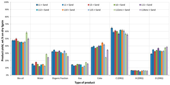 Figure 1 and Figure 2 follow some common trends. Apparently, in all cases the use of H2SO4 has some specific effects. Comparing lignins L1 to L2, L5 to L6, and L11 to L12, in which cases delignification took place with and without the use of H2SO4 catalysis, runs L1, L5, L11 (no H2SO4) produced more organic fraction and less coke compared to the lignins retrieved from H2SO4-assisted delignification. This was valid for both thermal and catalytic pyrolysis. In addition, elemental analysis of the produced bio-oils showed that lignins retrieved from delignification conditions where no H2SO4 was used, produced bio-oils with higher C and lower O contents with the exception of the pair L11 and L12 where the reverse was observed. A possible explanation for this is the partial degradation of the retrieved lignin. Use of H2SO4 created more severe conditions which led to enhancement of recondensation reactions of lignin. The more degraded condensed lignins formed more coke, therefore less C moved to the desirable products, which is the organic fraction of the bio-oil, and this is especially true in the case of catalytic pyrolysis where use of H2SO4 resulted in higher coke production. When the less severe catalysts H3PO4 and oxalic acid are used, the effects were negligible due to their lower severity. In all cases where an acid was used during the organosolv pretreatment, the bio-oils produced, whether thermal or catalytic, had a lower O content. It should be noted at this point that although both H3PO4 and oxalic acid were much less severe compared to H2SO4, the achieved delignification degrees (DD) were very high, while the produced pulps were found to be extremely suitable for saccharification and subsequent fermentation [22]. This means that the lignin can be removed from lignocellulosic biomass without causing too much degradation and chemical modification which is essential in its downstream valorization, as seen from this work. On the other hand, the use of different solvents in this work, acetone and ethanol, during the delignification step, did not seem to have any particular effect on the pyrolysis products. This would suggest that the organosolv process can be more flexible in terms of use of solvents since the further degradation of lignin can be avoided with different types of solvents.