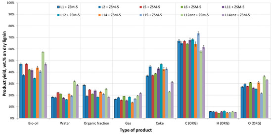 Typical standard deviation (sd) for the mass balances was between 1.5%–2.5%. In the case of individual gas yields the sd was negligible at 0.2%, hence it cannot be depicted in Figure 3 and Figure 4 as error bars. Overall the organic fraction was between 26 and 34 wt.% in the case of thermal pyrolysis and between 18 and 28 wt.% in the case of catalytic pyrolysis. Water production was around 12–17 wt.% for thermal pyrolysis and 17–22 wt.% for catalytic pyrolysis for the lignin rich residues. Residues L12enz and L14enz produced significantly more water, reaching up to 30 wt.%. Gases production were 12–16 wt.% and 14–22 wt.% for thermal and catalytic pyrolysis, respectively. As expected in lignin pyrolysis, coke production was rather high, around 40 wt.%, increasing slightly when ZSM-5 was used due to the catalytically produced coke. The main deoxygenation pathway was through dehydration reactions producing more H2O. The addition of ZSM-5 resulted in the reduction of the oxygen content of the bio-oil, along with the reduction of its yield due to the loss of C, H, and O to other pyrolysis products. Thermal pyrolysis bio-oils had O contents of 28–38 wt.% on dry bio-oil which dropped to 22–35 wt.% with the use of ZSM-5. Overall, use of ZSM-5 resulted in an increase of gases, coke, and water formation, and in the decrease of the organic fraction yield and bio-oil O content.