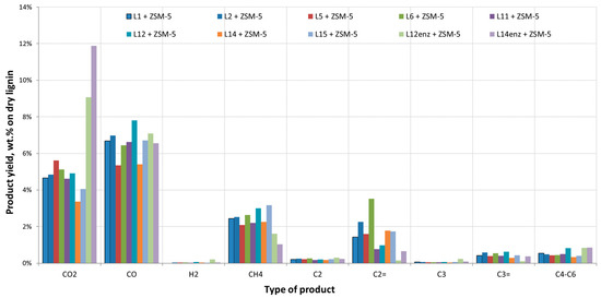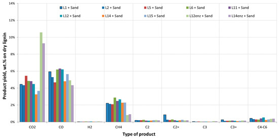 The two lignins received after the enzymatic hydrolysis of pulps from the runs L12 and L14 and the consequent fermentation of the produced sugars had a significantly different behavior. Gas and water production was higher while coke yield was lower when compared to the other lignin samples. In addition, the O content of the produced bio-oils both from thermal and catalytic pyrolysis was higher. This can be attributed to the lower lignin content of these samples. As can be seen in Table 1, lignin content was 23.5% and 49% for samples L12enz and L14enz, respectively, indicating the presence of other species in the form of oligosaccharides and proteins retrieved from the yeast cells that were recovered along with the solid residue of the fermentation process. The lower lignin content of these samples translates into a higher O content (Table 1) of the feedstocks which also results in a higher O content in the produced bio-oils. Figure 3 and Figure 4 present in detail the gases produced during the pyrolysis of all lignin residues.