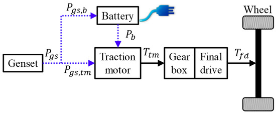 The powertrain configuration of the target REEV is shown in Figure 2. The output power of the genset can be divided into to charge the battery and to drive the TM. is the battery power; and are the output torques of the TM and the final drive, respectively. The REEV is an electric multi-purpose vehicle (MPV) with a 40 kW engine, a 25 kW generator, a 150 kW traction motor (TM), and a 16 kWh lithium-ion battery pack. The specifications of the REEV are summarized in Table 1. During braking, the total required braking torque consists of the regenerative braking from the TM and the friction braking from the hydraulic braking. Brake-by-wire capabilities are required for both braking systems [30]. Since the hydraulic braking system of the target REEV does not have the brake-by-wire capability, the regenerative braking is not used for the target REEV. The simulation models, with some component models adapted from [31], are described as follows.