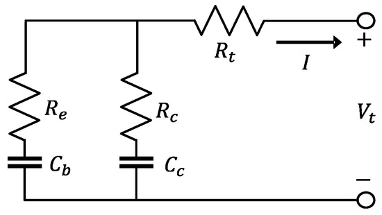 The battery pack consists of 2208 cells. 96 cells are connected in series to form a module, and 23 modules are connected in parallel. The resistance capacitance (RC) battery model in ADVISOR [32], which consists of two capacitors and three resistors as shown in Figure 6, is used to describe the battery dynamics as follows: