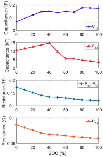 where and are the number of cells in series and parallel, respectively. The SOC of the RC model can be obtained using the voltages of the two capacitors as shown below [34]: