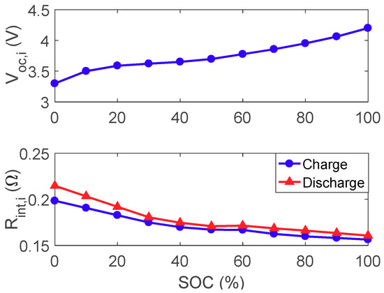 where is the internal resistance; is the open circuit voltage. Both and are functions of the SOC. The parameters of a single battery cell for the Rint battery model identified using the HPPC are shown in Figure 9. Two lines are used to represent as functions of the SOC for battery charging and discharging, respectively. The parameters of the battery pack can then be obtained as follows:
