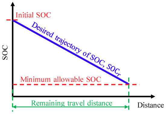 So as to develop the adaptive PMS suitable for different driving cycles, a charge-depleting problem based on the energy-to-distance ratio [38] is formulated in this paper. Since the optimal SOC-distance curve of DP looks like a line, the slope can be approximated by the energy-to-distance ratio, which is defined as the difference between the initial SOC and the minimum allowable SOC divided by the remaining travel distance. The desired trajectory of SOC for discharging the battery can then be obtained as shown in Figure 12.