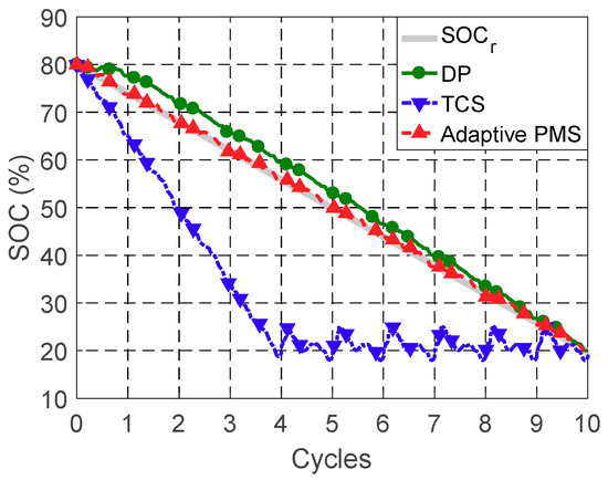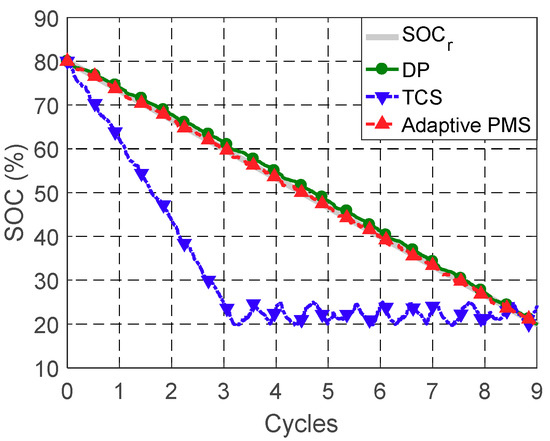 where denotes the cost-to-go for each feasible state variable at each time step. The initial state and final state are the initial SOC and final SOC. A global optimum solution map is established backward in time by storing the optimum for each . From a specified initial state , the optimum control stored at can be used to find the next state by satisfying the battery dynamics in Equation (20). The optimum control stored at can then be used to find the next state . The optimum control policy can then be obtained forward-in-time by repeating the process until the final state is reached