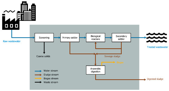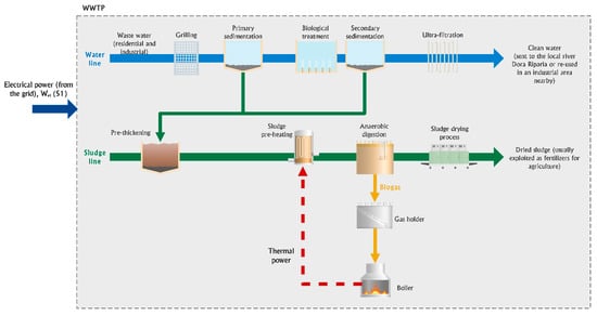 A WWTP is mainly divided into two sections (Figure 1): (1) a water line, in which wastewater undergoes to physical, biological and chemical treatments in order to meet the thresholds imposed by the existing standards; (2) a sludge line, where the organic matter separated during water purification is pumped towards the anaerobic digester. During the anaerobic digestion, microorganisms break down the organic substance contained in the sewage sludge and partially convert it into biogas. A WWTP needs electrical and thermal energy to sustain all these processes [42,43].