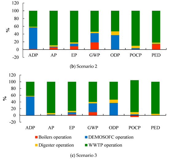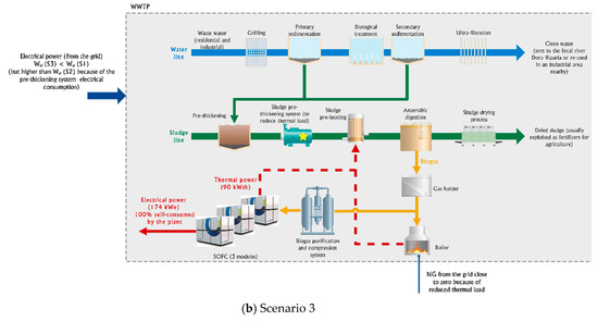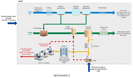 In Scenario 2, the installation of a not-conventional CHP unit improves the WWTP energetic self-sufficiency. Its very high electrical efficiency, and the operation in CHP mode are the motivation for the choice of the SOFC technology. Its adoption in the project is oriented towards its market introduction on an industrial scale using a demonstration of its energetic and environmental performance [50]. SOFCs generate electricity directly from the chemical energy contained in the biogas, with high efficiency and near-zero emissions of pollutants (e.g., CO, NOx, and hydrocarbons). The disadvantages are fuel cell sensitivity to biogas contaminants (in sewage biogas mainly sulfur and silicon compounds) and to thermal cycles (shutdown should be avoided). As shown in Figure 3, three main sections represent the change in infrastructure in the WWTP: