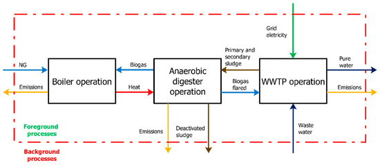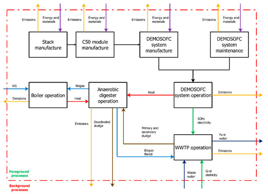 The comparative nature of this LCA is reflected in the definition of system boundaries of the three scenarios. All the processes shared among the compared scenarios are left outside of the boundaries. In Figure 4 and Figure 5 the processes, material, and energy flow used to characterize the three scenarios are represented. The main foreground processes are boilers, digester, WWTP operations, and SOFCs CHP system manufacture, operation, and maintenance.
