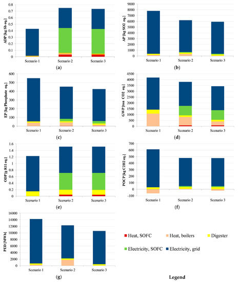 This work thus assesses the potential environmental impacts of a CHP plant that employs medium size SOFCs, fed by biogas produced by a WWTP facility, with a life cycle (cradle to gate) approach. The first section is related to the methodology presentation, the scenarios definition and the Life Cycle Inventory (LCI) (Section 3, Section 4 and Section 5), which discuss all the input data. Then, Section 6 shows and discuss the results. The primary goal of this study is the characterization of the energetic and environmental burdens of the three WWTP case studies through sustainability and life cycle impact indicators. The LCA developed in this work is comparative, so benefits or disadvantages are relative to the reference scenario (Scenario 1).