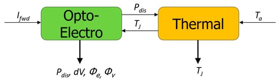 The opto-electro model requires forward current and operating chip junction temperature as input and provides power dissipation, voltage drop, emitted optical energy and luminous flux as output. The thermal model requires power dissipation and an ambient temperature as input and provides operating junction temperature (and potentially other temperature points, such as solder temperature) as output. These two models are to be solved in a co-simulation framework until such time as their results converge.
