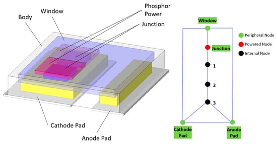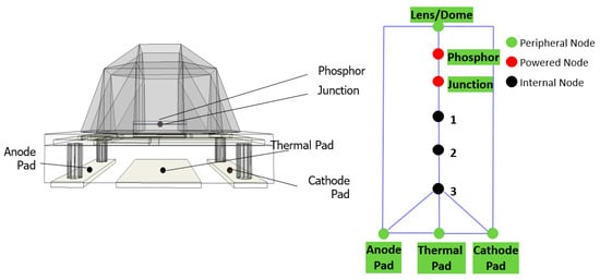 As this part had no thermal pad, and prediction of the Phosphor temperature was not required by the intended design requirements, the nodal topology displayed in Figure 3 was used.