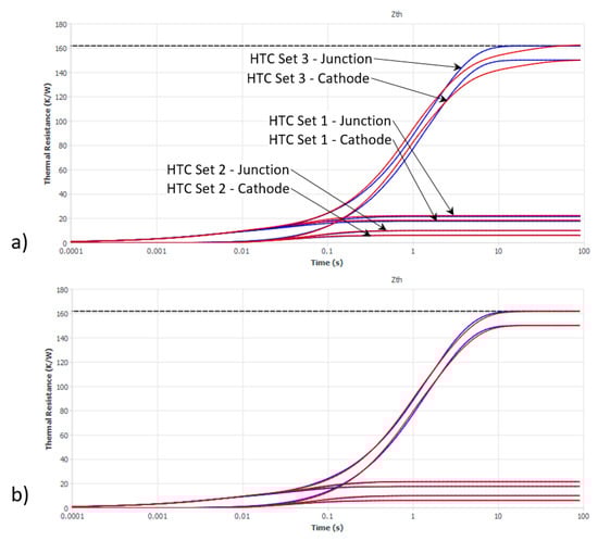 The initial portion of the heat flow path, represented in Figure 3 by the Junction, Node 1, Node 2 and Node 3, was considered to be independent of the thermal operating environment into which the CTM was placed. As such, the thermal capacitances at these nodes, as well as the thermal resistances between, were extracted directly from the structure function, which was derived directly from the measured thermal response [10]. The remaining thermal resistances and capacitances were determined by a process of optimization. First, the thermal response of junction and cathode pad of the 3D detailed model were simulated in three differing heat transfer coefficient (HTC) environments. These were realized by applying differing HTCs at the cathode and anode pad peripheral faces of the 3D detailed model (Table 1). These were intended to cover a range of possible operating environments—in this case, differing substrate types and substrate circuitry onto which the LED part may be placed. Note that the high HTC values were due to the very small areas involved in the physical size of the pads.